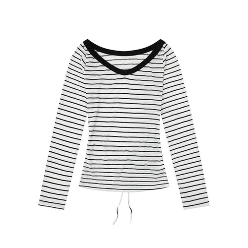 Black and White Striped V-Neck Long Sleeve